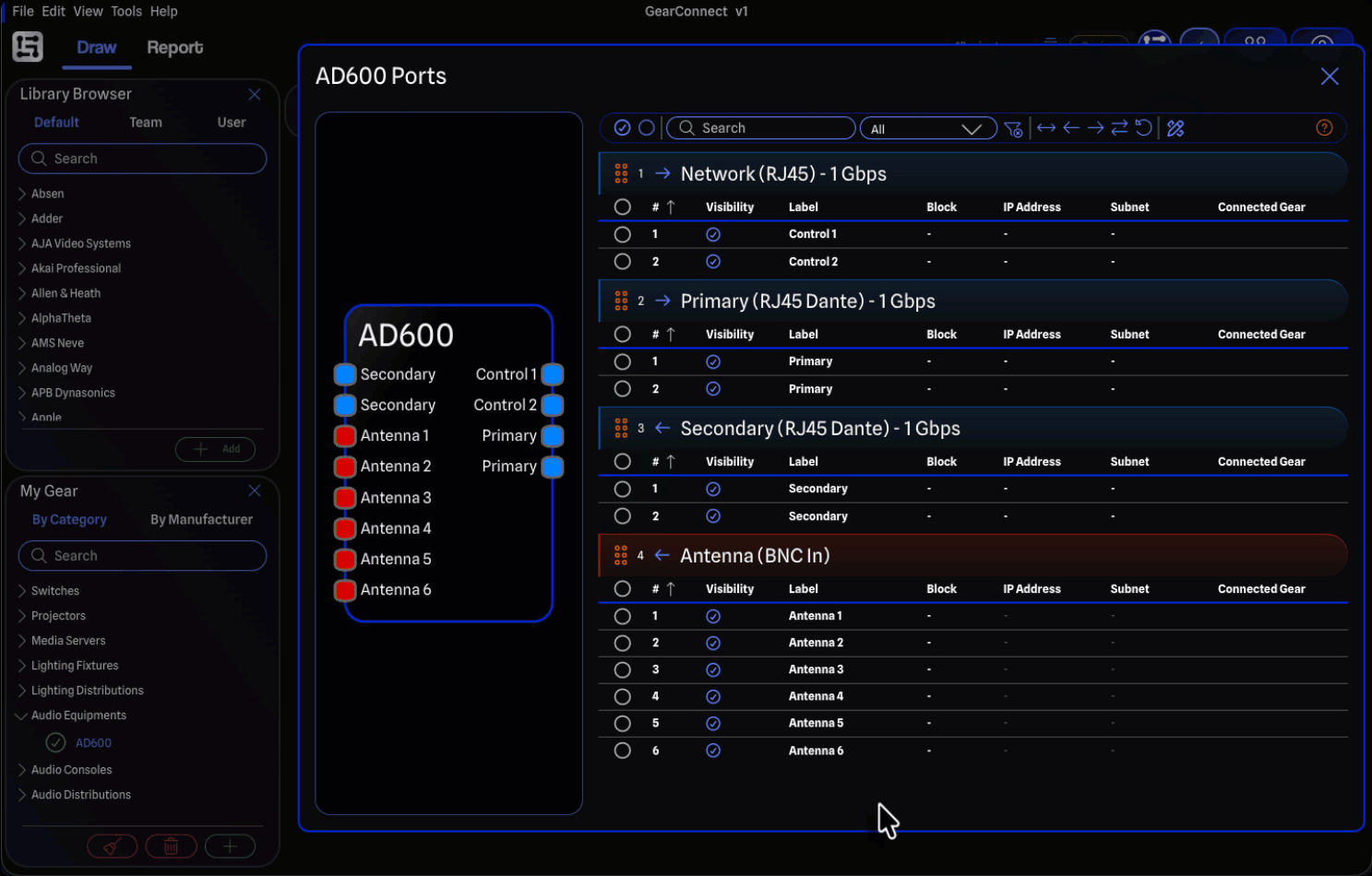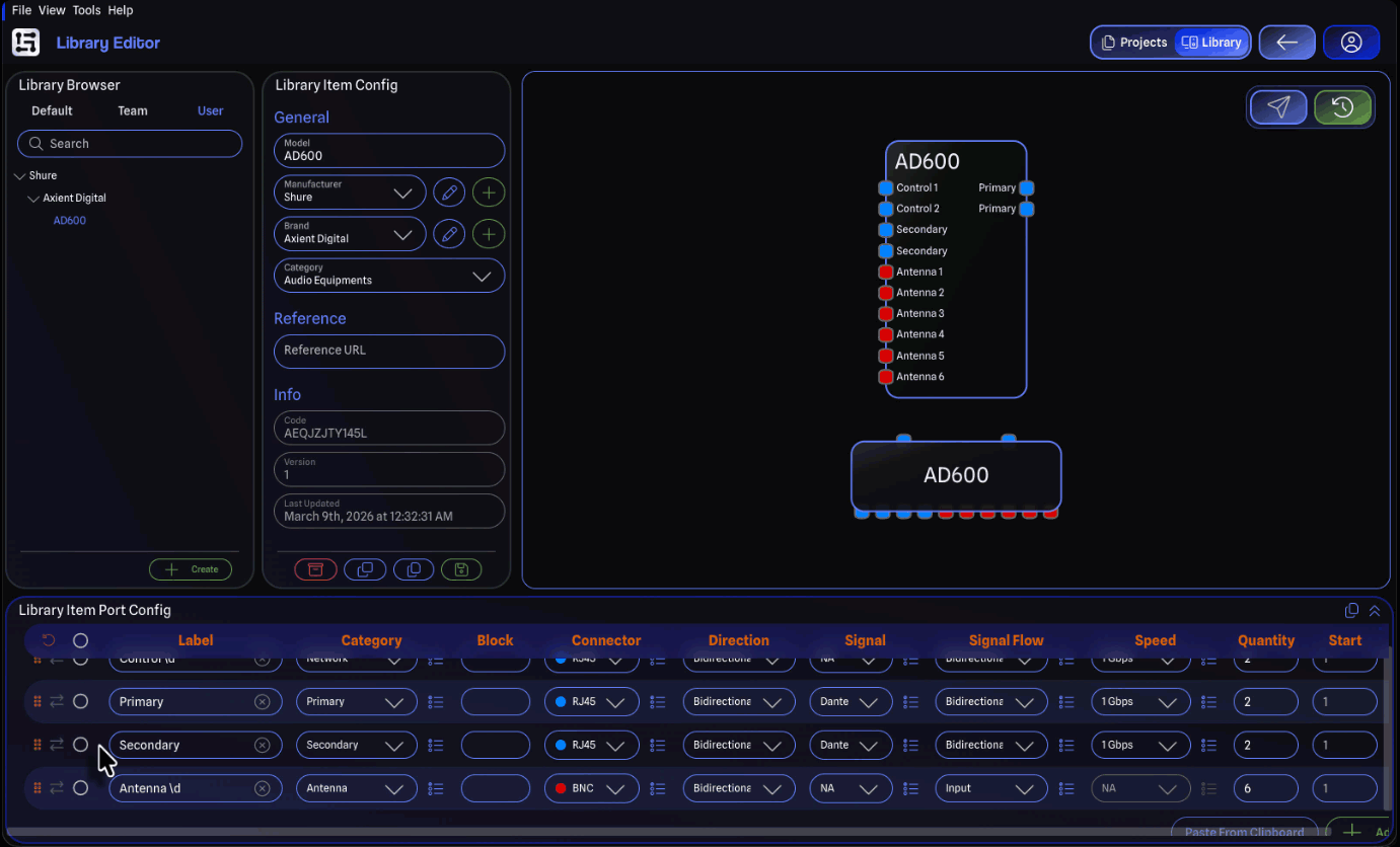 - Ports: Block, group order, side override, connected gear and port labels